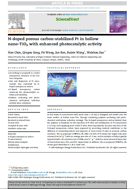 當前位置 : 首頁 > 資訊動態 > 論文發表 > N-doped porous carbon-stabilized Pt in hollow nano-TiO2 with enhanced photocatalytic activity