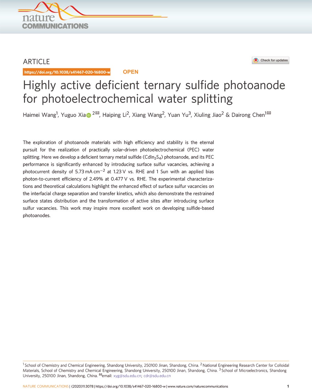 當前位置 : 首頁 > 資訊動態 > 論文發表 > Highly active deficient ternary sulfide photoanode for photoelectrochemical water splitting