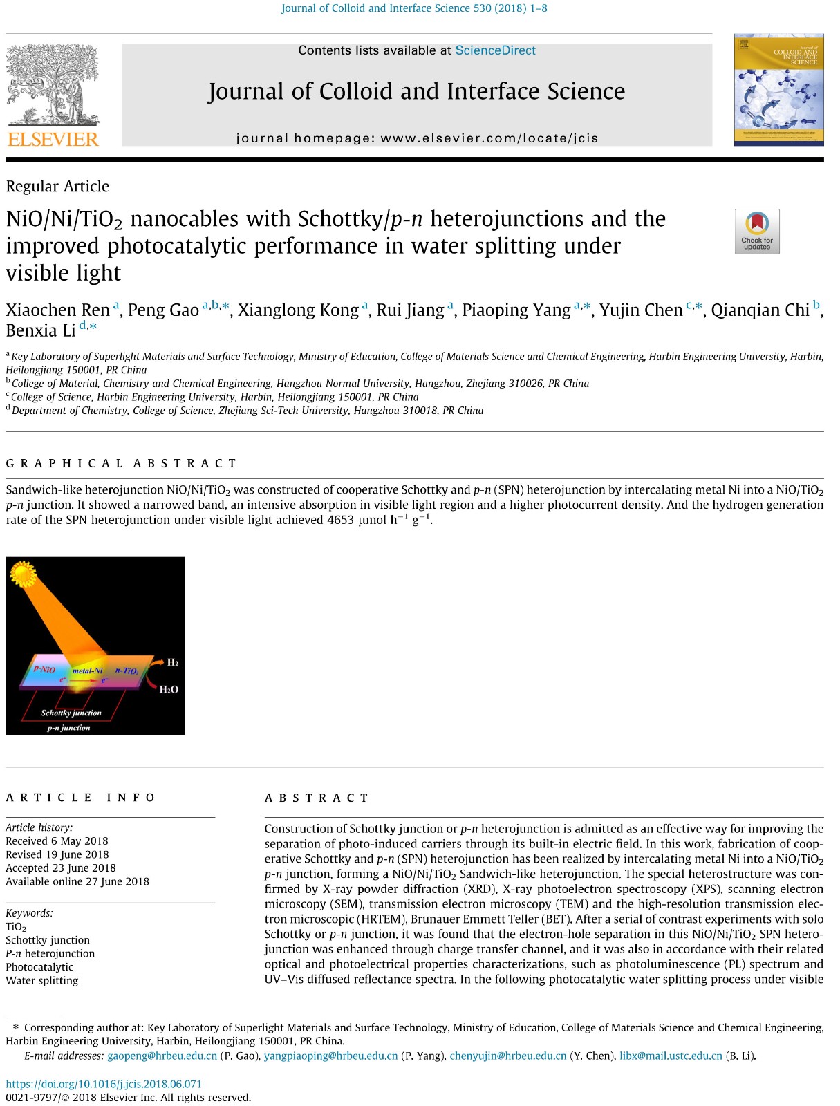 當前位(wèi)置 : 首頁(yè) > 資訊動態 > 論文發表 > NiO/Ni/TiO2 nanocables with Schottky/p-n heterojunctions and the improved photocatalytic performance in water splitting under visible light