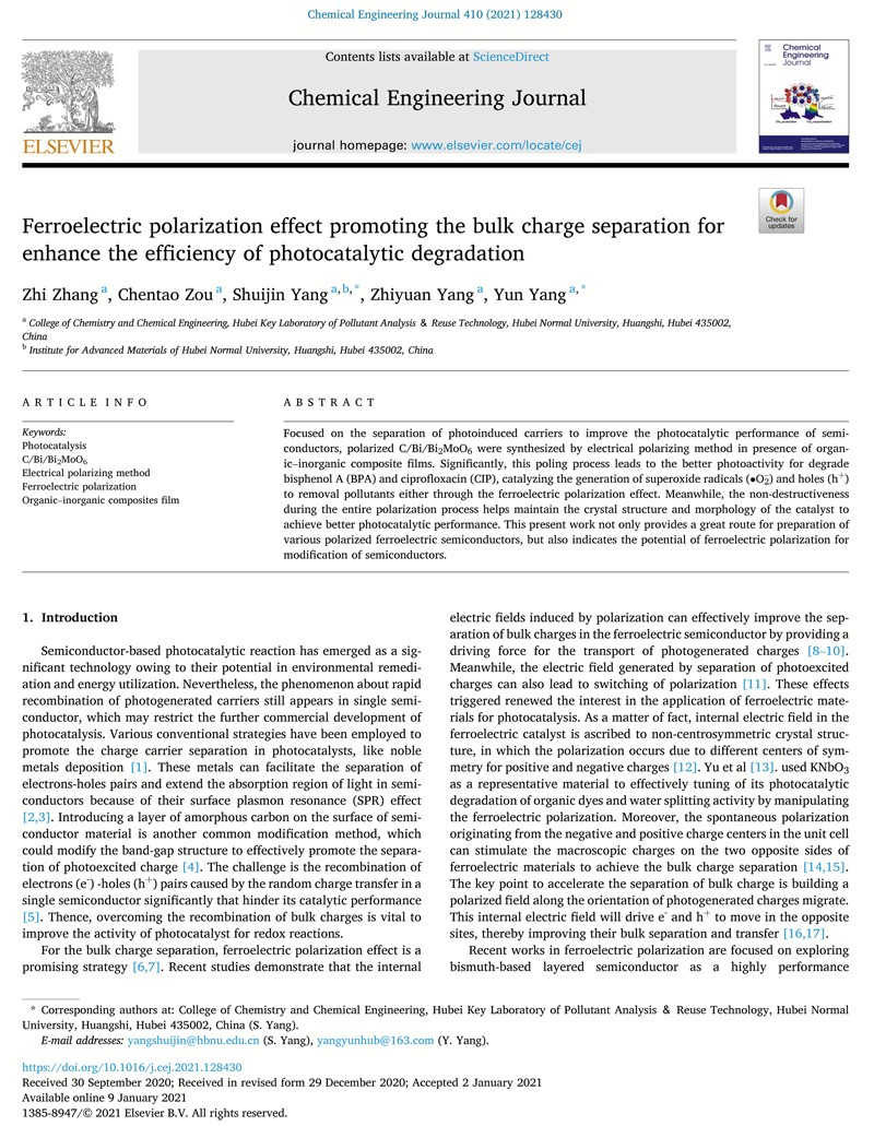當前位置 : 首頁 > 資訊動態 > 論文發表 > Ferroelectric polarization effect promoting the bulk charge separation for enhance the efficiency of photocatalytic degradation