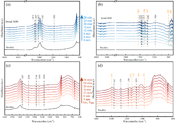 圖 2 BGO (a)BGS0.1 (b)吸附過程和BGO (c)BGS0.1 (d)光催化NO去除過程的原位DRIFTS