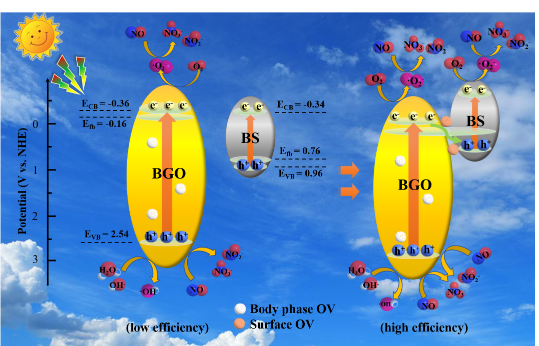界麵光生(shēng)載流子和活性物種調控和體係的光(guāng)催化性能(néng)密切相關。表麵OVs作為吸附和反應活(huó)性位點,易於協同異質結構提高載流子的轉移和分離效率(lǜ),有效促進活性物種的生成和體係(xì)光催化性能的改善,因此在光催化NO去除領域頗受關注。為(wéi)提高軟鉍礦Bi12GeO20的光催化NO去除效率,本文(wén)首次以硫粉為(wéi)硫源,采用綠色環保的機械球磨技術製備了Bi12GeO20基複合材(cái)料Bi12GeO20-Bi2S3。經分析表征,證(zhèng)實形(xíng)成(chéng)了具有豐富表麵OVs的n-p異質結構的複合體(tǐ)係。