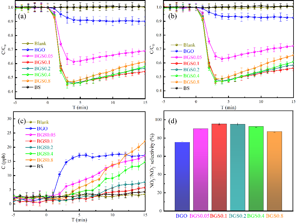 這(zhè)些複合材料在可見光下可(kě)有效增強ppb濃度水(shuǐ)平NO的光催(cuī)化去除,對生成硝酸根和亞硝酸根離子具有較高的選擇性,顯著抑製了毒性中間體NO2的產生。其中,最佳的(de)複合樣品BGS0.1具有最高的NO去除率和最強的硝酸(suān)根和亞硝酸根選擇性(96%),這主要與增強的可見光(guāng)吸收、優異的微觀結構和匹配的(de)能帶結構密(mì)切相關。