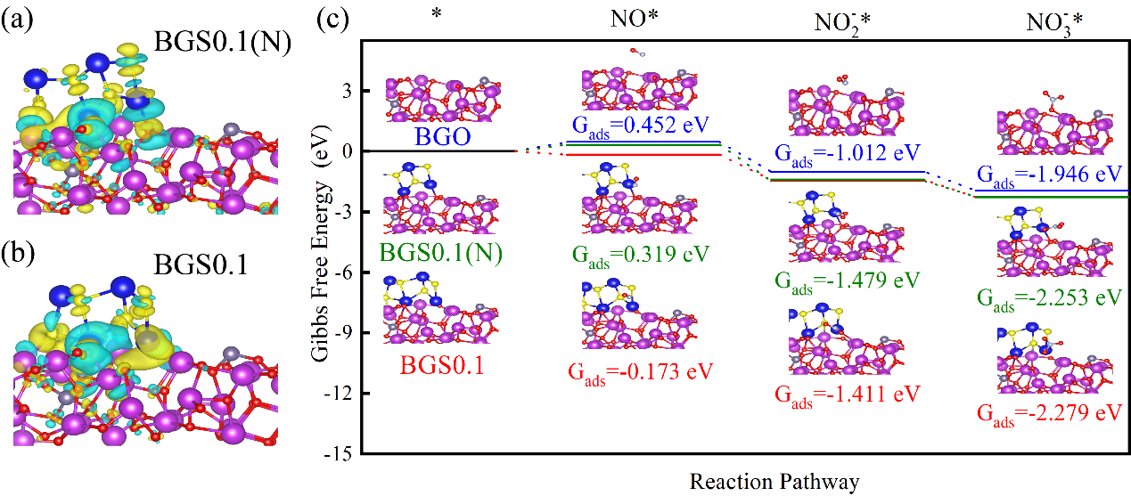 3 BGS0.1(N) (a)BGS0.1 (b)的變化密度分布(bù),BGO, BGS0.1(N), BGS0.1 的(de)吸附和反應活化能的DFT計算變化 (c)