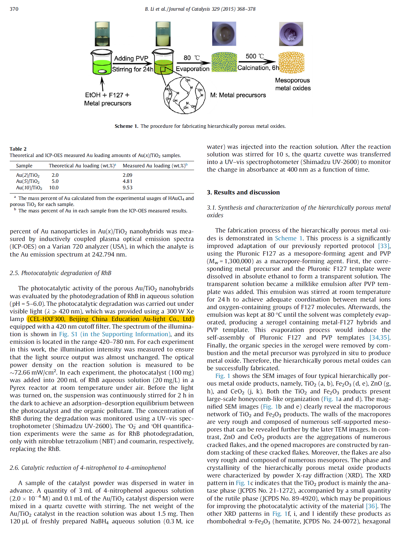 Synthesis of hierarchically porous metal oxides and Au/TiO2 nanohybrids for photodegradation of organic dye and catalytic reduction of 4-nitrophenol