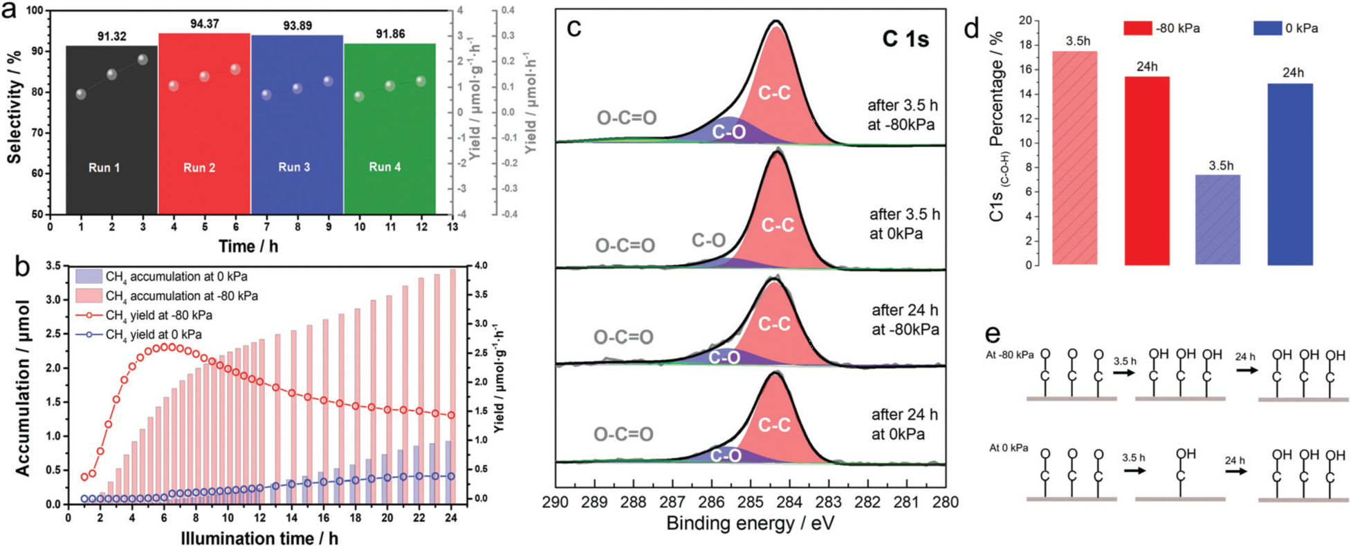 催化反應的穩定性在實際實(shí)施(shī)中舉(jǔ)足(zú)輕重,我們測試了在(zài)低真空下反應四個循(xún)環(圖2a)和連續反(fǎn)應24小時(圖2b)的情況,實(shí)驗表明,CH4產率和選擇性均穩(wěn)定。24小時(shí)後,CH4產率在低真空下是3.4umol,在大氣壓下是0.9umol.我們用(yòng)XPS分析(xī)了(le)在不同氣壓下的催化反應過程(圖2c-d)。低真空(kōng)下,反應3.5小時,催化劑表麵COH*飽和,一直持續到反應24小時(有CH4生成);而在大氣壓下,反應3.5小時的COH*很少量,反應24下時催化劑表麵的COH*才逐漸飽和(如圖2e)。