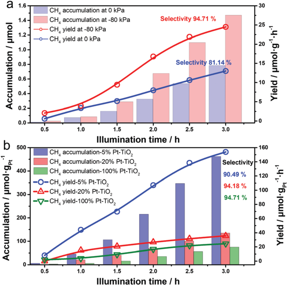 圖4低真(zhēn)空(kōng)下光催化(huà)CO2反應的驗證.(a)Pt-TiO2的(de)CH4產率(lǜ),(b)不同Pt含量的CH4產率對(duì)比.