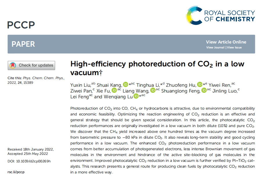 中文標題: 低真空下的(de)高效光催化二氧(yǎng)化碳還原反(fǎn)應