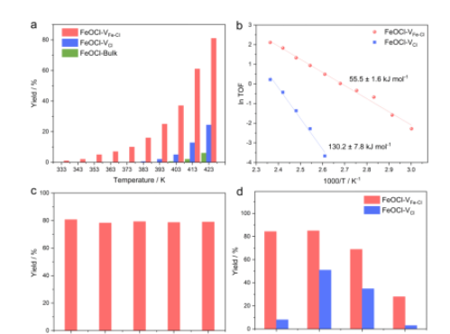 受益於此,帶有Fe-Cl空位簇的FeOCl納米(mǐ)片在(zài)與環氧化物的二氧化(huà)碳環化反應(yīng)中表現出更強的(de)環狀碳酸酯生成能力,FeOCl-VFe-Cl納米片在二氧化碳與環氧丙烷的(de)環化反應(yīng)中表現出55.5±1.6 kJ mol-1的活化能,是(shì)具有單缺陷活化能的一半。
