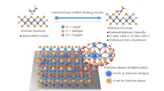 在此,我們以(yǐ)二維FeOCl為模型,提出通過缺陷工(gōng)程(正丁基鋰插層以及CO2插層剝離)在限定區域內構建(jiàn)電子給體(Cl位(wèi)點)和受體單元(Fe位(wèi)點)來促進環(huán)氧化物開環。通過結合理(lǐ)論模擬和原(yuán)位漫反射紅外傅(fù)裏葉變換光譜,我們表明Fe-Cl空位簇的引入可以激活惰性鹵素端(duān)麵,提供含有電子供體和受體單元的反應位點,從而加強環氧化物的吸附和促進C-O鍵裂解。