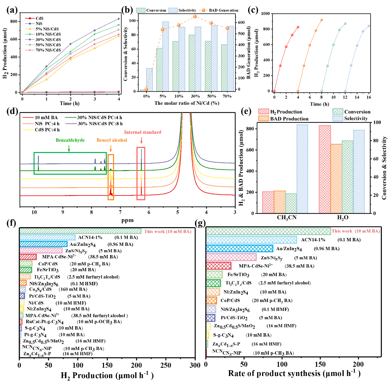 最優的光(guāng)催化30% NiS/CdS在可見光(guāng)照射下有顯著的光催化產(chǎn)氫速率和苯(běn)甲醛合成速率分別為207.8μmol h-1, 163.8μmol h-1,比單獨硫化(huà)鎘性能高139和950倍。該研究極大地利用光產生的空穴(xué)和電子用於生產高附加值精細化學物質和(hé)氫氣,因此在(zài)綠色可再(zài)生能源技術的發展及光催化合成領域中具有重(chóng)要(yào)的意(yì)義(yì)。