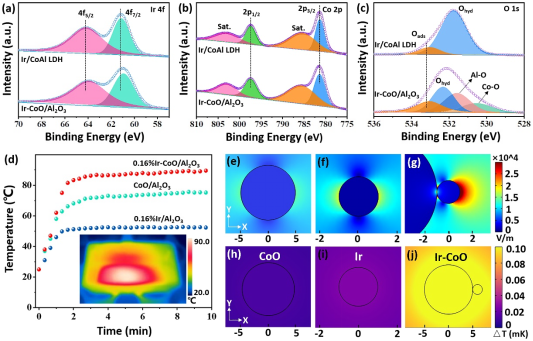 圖1、Ir/CoAl LDH和Ir/CoO/Al2O3的高分辨XPS能譜,(a) Ir 4f,(b) Co 2p和(c) O 1s;(d) CoO/Al2O3,Ir/Al2O3和Ir/CoO/Al2O3在可見光照射下的溫度變化曲(qǔ)線;光照射下(xià)CoO、Ir納米顆粒和Ir-CoO複(fù)合材料的(e-g)感(gǎn)應電場分布和(h-j)溫度分布。