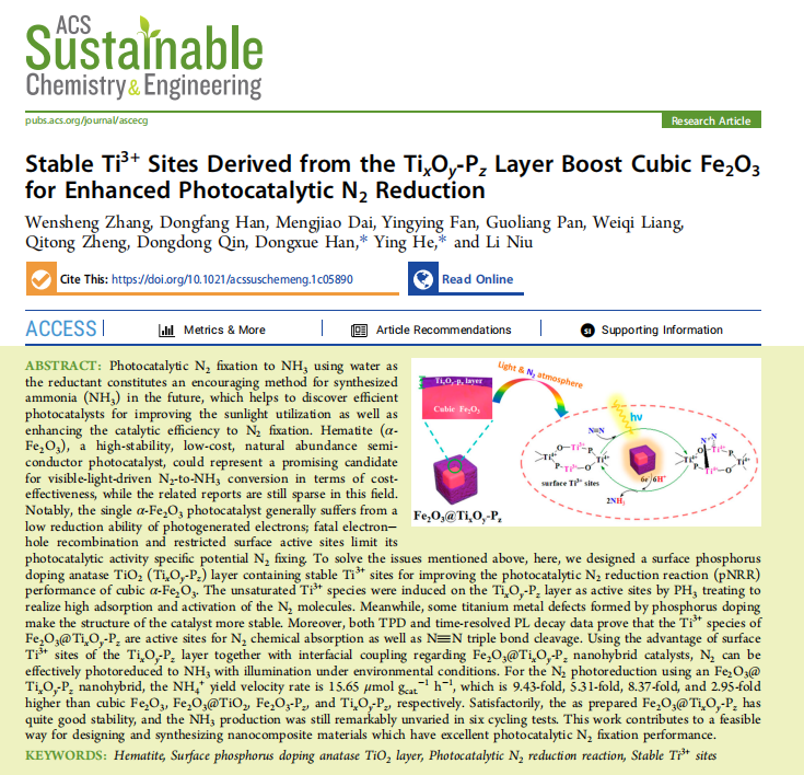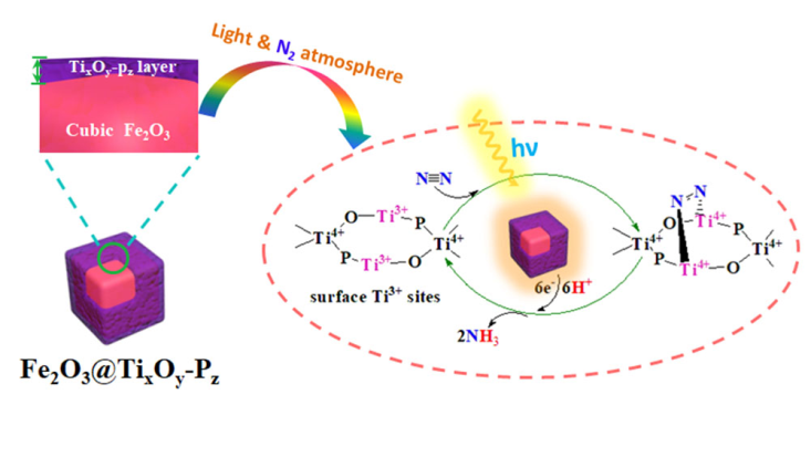 標(biāo)題:Stable Ti3+ Sites Derived from the TixOy-Pz Layer Boost Cubic Fe2O3 for Enhanced Photocatalytic N2 Reduction