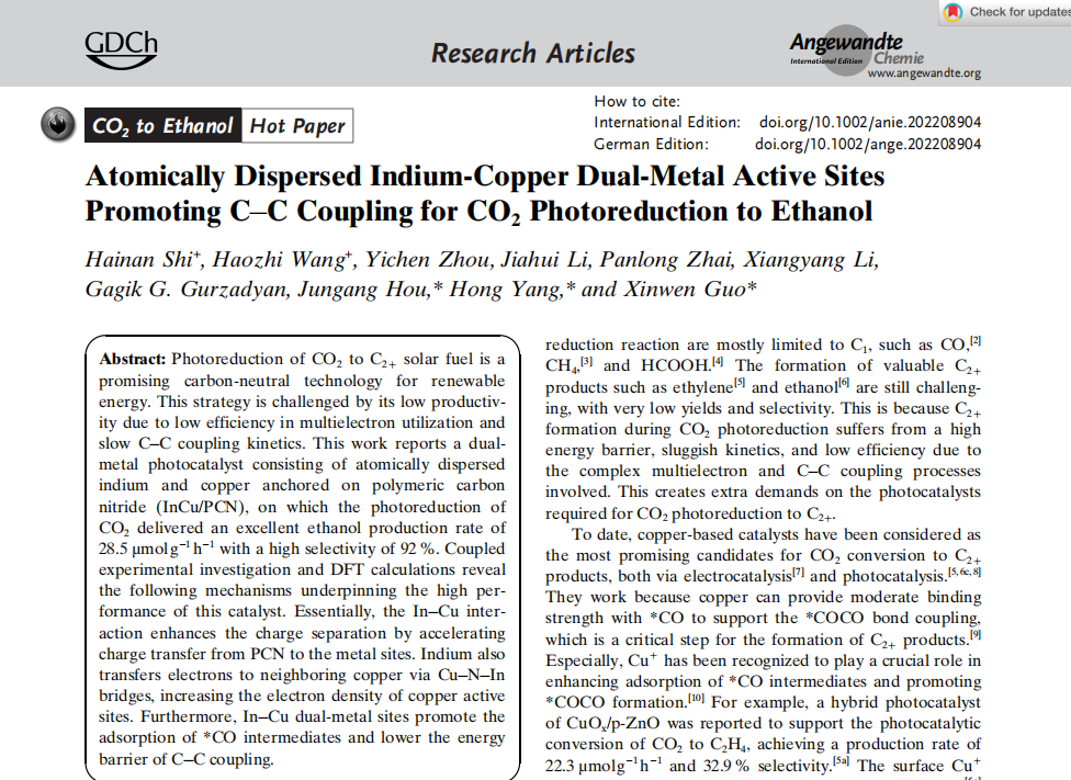 標題: Atomically Dispersed Indium-Copper Dual-Metal Active Sites Promoting C−C Coupling for CO2 Photoreduction to Ethanol