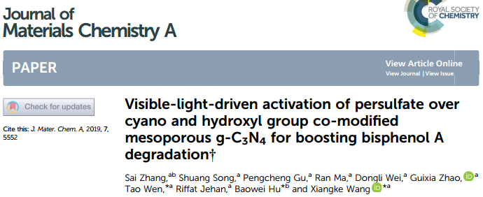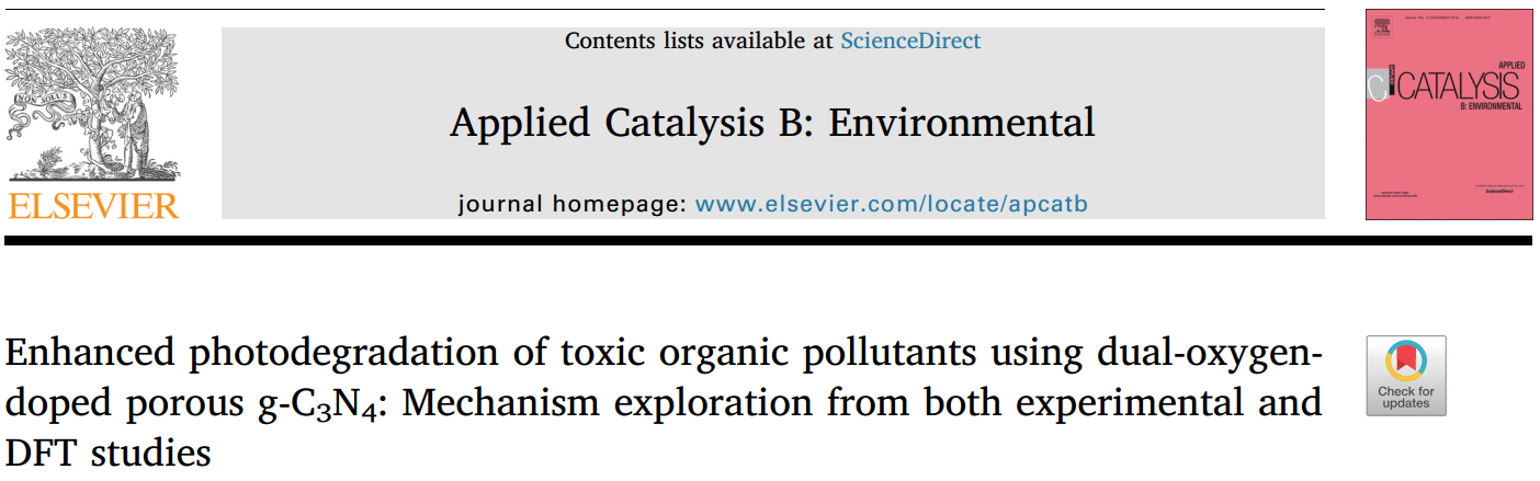 近日,華北(běi)電力大(dà)學王祥(xiáng)科研究(jiū)團隊在環境催化權(quán)威期刊 (Applied Catalysis B: Environmental,最新影響因子11.698)上在線發表了題為(wéi)“Enhanced photodegradation of toxic organic pollutants using dual-oxygen-doped porous g-C3N4: Mechanism exploration from both experimental and DFT studies”和材料化學領域權威期(qī)刊(Journal of Materials Chemistry A,最(zuì)新影響因子9.931) 上在線發表了題為“Visible-light-driven activation of persulfate over cyano and hydroxyl group co-modified mesoporous g-C3N4 for boosting bisphenol A degradation”的(de)新研究成果。