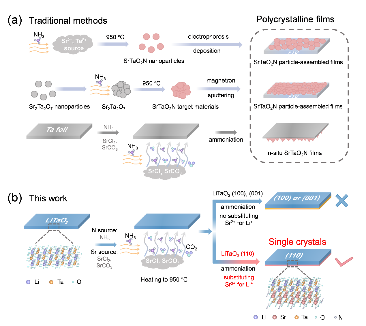 1. 本(běn)研究提出了一(yī)種無機蒸氣法,克服了單晶生長過程中Sr2+、Li+、N3-等離子遷(qiān)移的動力學限製,實現了LiTaO3(110)向SrTaO2N(110)的拓(tuò)撲轉換,並首次製(zhì)備出厘米級SrTaO2N單晶