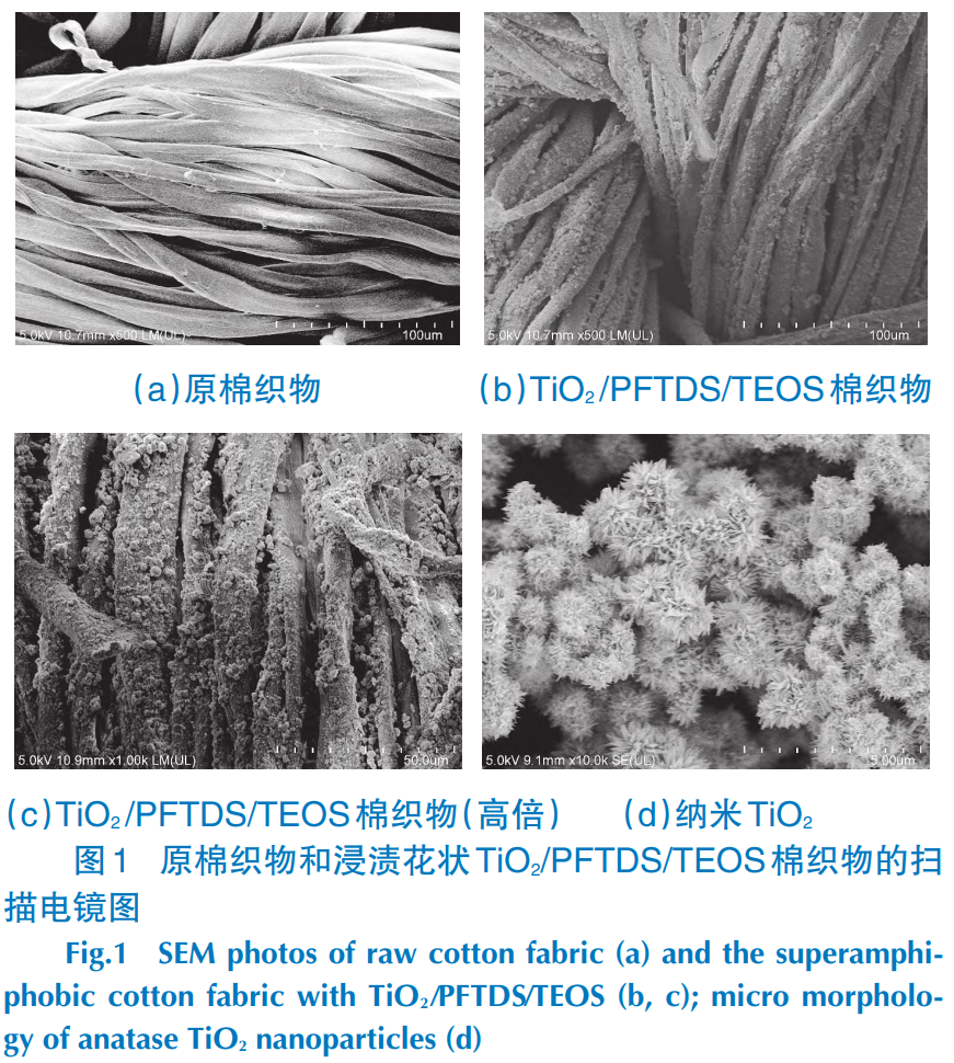 GUO等(děng)人[16]通過在棉織物表麵包覆蓬鬆的球形 SiO2納米(mǐ)顆粒,再進(jìn)一步用低表麵能材料含氟化合物改性,獲得雙層微/納米結構的多功能超拒液棉織物。TiO2因優異的光電(diàn)化學(xué)特性和經濟效益高[17-18],在紡織領域常用於(yú)光催化降解有機汙染物,以(yǐ)及抗菌和抗紫外(wài)線產品[19-20]。織物表麵沉積TiO2納(nà)米顆粒的研究不在少數,但對多層次的(de)TiO2與含氟低表麵能材料共(gòng)摻雜構(gòu)築的超(chāo)雙疏與光催化(huà)棉織(zhī)物的(de)研究還沒有報道(dào)。