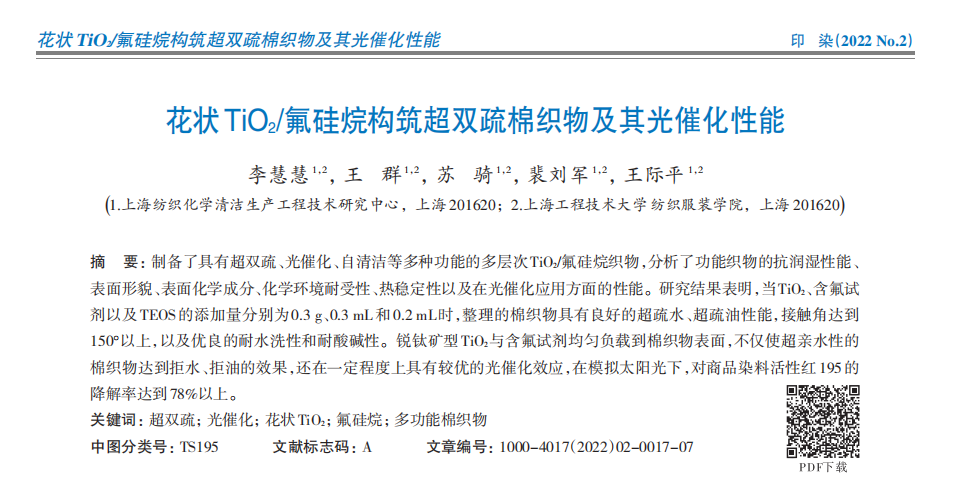 中(zhōng)文標題:   花狀TiO2/氟矽烷構(gòu)築超雙疏棉織物及其光催化性能