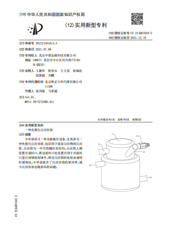 本申請(qǐng)涉及一種實驗操作設備,尤(yóu)其涉及(jí)一 種光催化反應容器,包括用於盛放反應物的反應 筒,反應筒為(wéi)一中空的(de)圓柱狀結構;反應筒上側 設置有通料口,所述通料口處設置有用於對通料 口進行封堵的封堵件;所述反應筒(tǒng)的底壁由(yóu)透明 材質製成。本申請提升了反應容器的整體性,減 少反應容器出現損壞的問題。