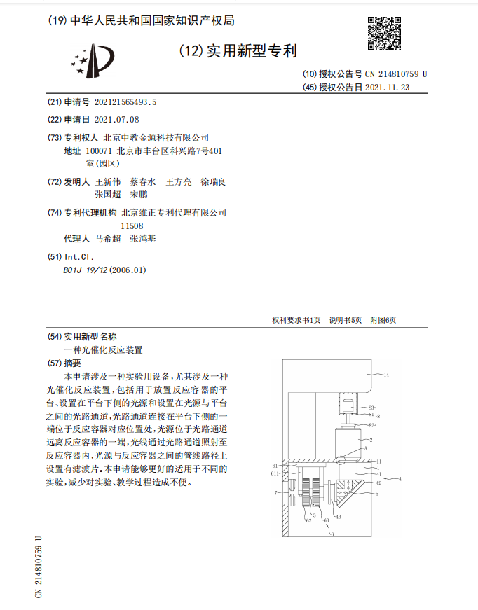 本申請涉及一種實驗用設備,尤其涉(shè)及一種 光催化反應裝置,包括用於放(fàng)置反應容器的(de)平 台、設置在(zài)平台下側的光(guāng)源和設置在光源與平台(tái) 之間的光路通道,光路通道連接在(zài)平台下側的一(yī) 端位於反應容器對應位置處,光源位於光路通道 遠離反應容器的一端,光線通過光路(lù)通道照射至 反應(yīng)容器內,光源與反應容器之間的管(guǎn)線路徑上 設置有濾波片。本申(shēn)請能夠更好的適用於不同(tóng)的 實驗,減少對實驗、教學(xué)過程造成不便(biàn)。
