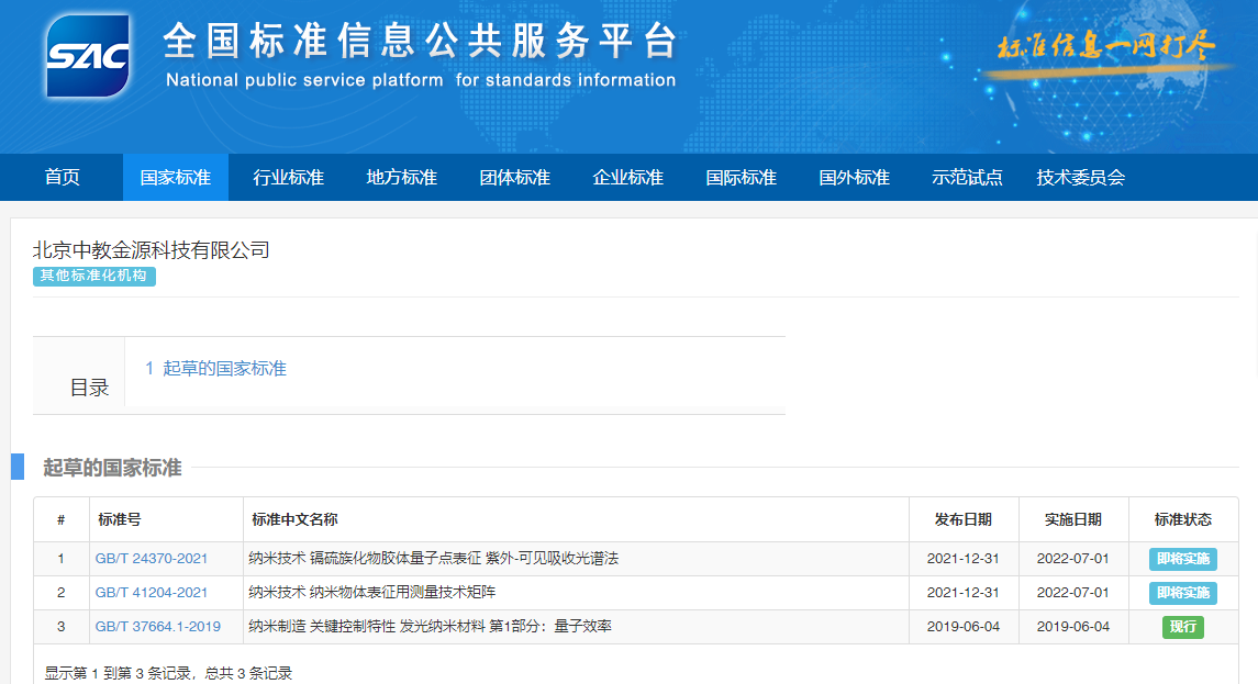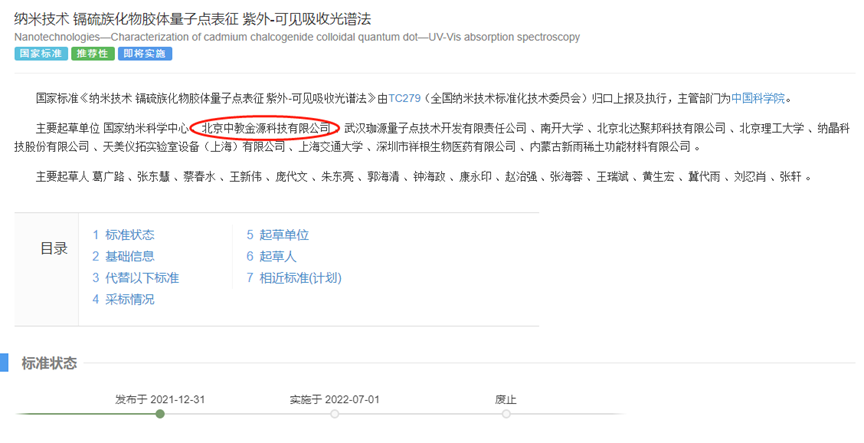 2021-12-31日由國家納米科學中心 、北京香蕉视频污视频科技有限公司 等起草(cǎo)的(de)國家(jiā)標準《納米技術 鎘硫族化物(wù)膠體量子點表征(zhēng) 紫外-可見吸(xī)收光譜法成功發布,並於2022-07-01起(qǐ)正式實施。