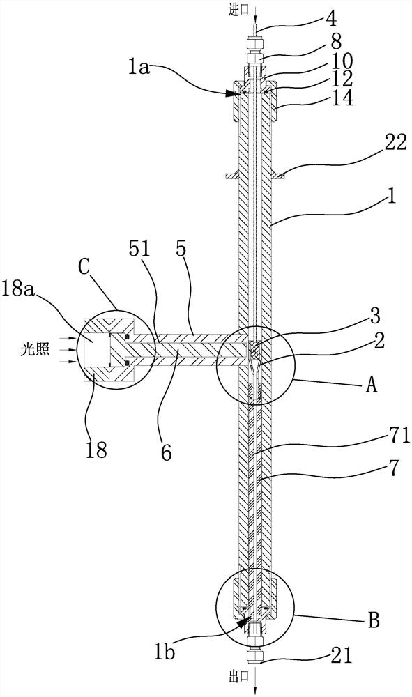 本申請涉(shè)及化學反應裝(zhuāng)置技術領域,具體(tǐ)公開了一種高(gāo)壓光熱協同多相反應器;本(běn)申請中的反應器(qì)包括采用金(jīn)屬材(cái)料(liào)製成的外套管,外套管的一端進料端,另一端為出料端;