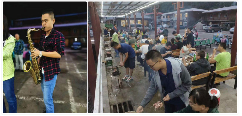到達(dá)的當天晚上,店(diàn)主為我們殺豬宰(zǎi)羊,準備了豐盛的當地(dì)特色的晚餐(cān),同事們紛紛動手,自己製(zhì)作燒烤食品,晚餐中,公司為幾位同事購(gòu)買了(le)蛋糕(gāo)慶祝生日。一位(wèi)多才(cái)多藝(yì)的(de)新同事(shì)還吹起了薩克斯。同事們的孩子玩起了煙花。