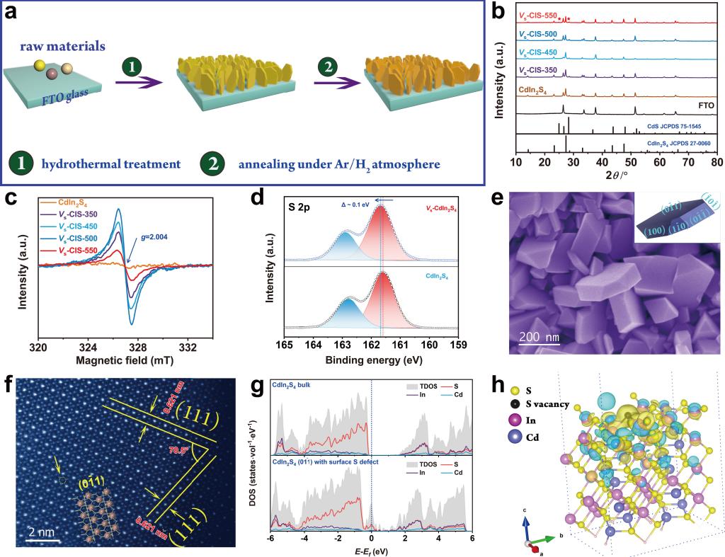 基於此,在陳代榮教授的指導下(xià),課題(tí)組首先合成(chéng)了(le)晶體結構穩定且中心金屬d電子易於(yú)調控的三元金(jīn)屬硫化物CdIn2S4。然後通過簡單的還原性氣氛處理的策略,成功(gōng)在CdIn2S4表(biǎo)麵引入硫(liú)空位(wèi)。通過(guò)電(diàn)子順(shùn)磁譜及球差電鏡表征確認了表(biǎo)麵硫空位的存(cún)在。光電催化水分解性能表明具有硫空(kōng)位的CdIn2S4光電陽極在1.23V (vs. RHE)外置偏壓和模擬太陽光下,獲得了5.73 mA cm-2的光電流密度(dù),是目前報(bào)道的金屬硫化物(wù)基單光(guāng)子吸收(shōu)體的最大值(zhí)。同時(shí),課題組(zǔ)在硫空位對PEC性能和電荷轉移動力學的影響上進行了係統(tǒng)地研究。實驗和理論計算表明,表麵硫空位(wèi)除能有效提高界麵載流子濃度、增大光電陽極/電解質能帶彎曲外,可以有效抑製CdIn2S4光陽極上的表麵態分(fèn)布,這也是獲得(dé)高光電流密度的本質原因。該工作為調節半導體/電解質界麵電位提供了一種途(tú)徑,也為其他金屬(shǔ)硫化物光(guāng)電陽極(jí)材(cái)料的設計提供新思路。