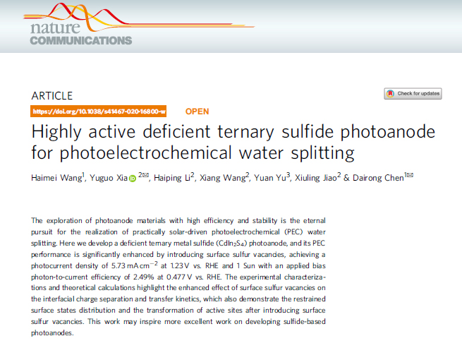 近日,我院陳代榮教(jiāo)授課題組在(zài)缺陷態金屬硫化物(wù)基(jī)光電陽極材料(liào)研究領域(yù)取得了重要進展。相關成果以“Highly active deficient ternary sulfide photoanode for photoelectrochemical water splitting” 為題,發表在國際知名期(qī)刊 Nature communications (IF=12.19) (DOI: 10.1038/s41467-020-16800-w)。2018級博士研究生王海梅為本文第一作者,夏玉國高級實(shí)驗師和陳代(dài)榮教授為本文的(de)共同通訊作者,山東大學(xué)為唯一完成單位。