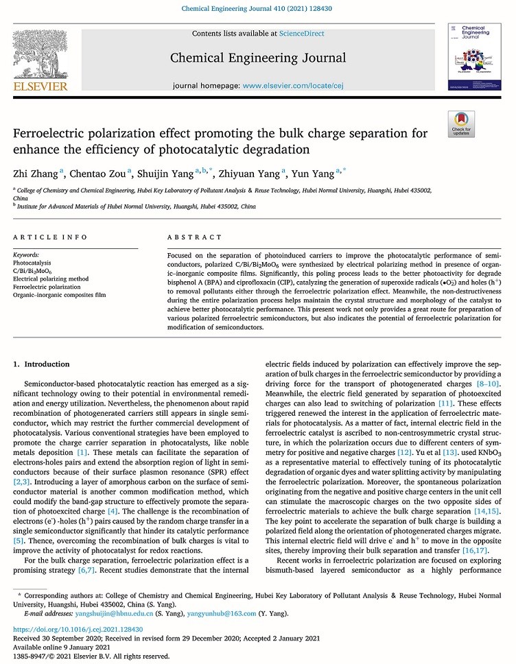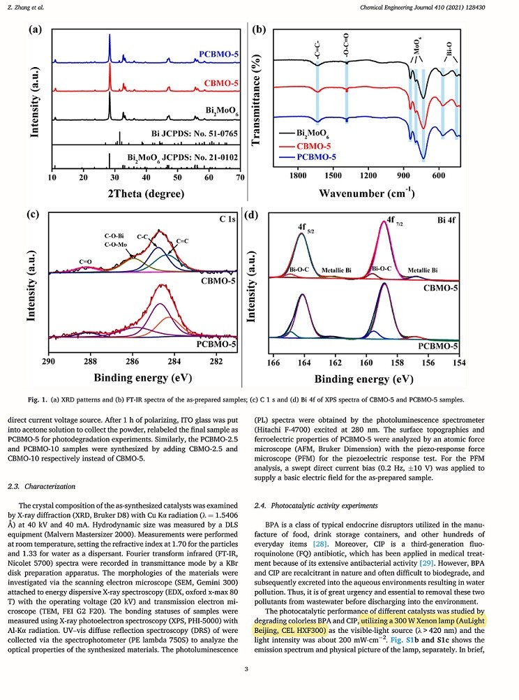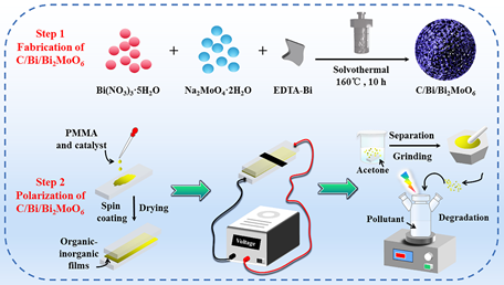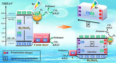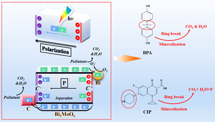 本文受啟發於極化促進體(tǐ)內電荷分離,選取具有鐵電性質的Bi2MoO6作為合適的改性材料。首先,通過一步溶(róng)劑熱法引入(rù)碳層和半(bàn)金屬Bi,對Bi2MoO6進行(háng)傳統(tǒng)方法的(de)改性,光催化降解環丙沙星(CIP)和雙酚A(BPA)的效率都能得到一定的提升。隨後,通(tōng)過對其簡便的電極化處理後(hòu),我們(men)觀察到極化後催化劑的降解效率得到大幅度提升。通過XRD、FT-IR、SEM、TEM、DRS等分析,我們發現極化前(qián)後沒有明顯地改(gǎi)變催化劑的晶相和化學鍵組分、微觀整(zhěng)體形貌、禁帶寬(kuān)度等。在不明顯改變催化劑的物理和化學等性質的條件下而又能提高光催化性能,這有利於維持催化劑的整體性和穩定性。另(lìng)外,PFM分(fèn)析證實了催化劑具有鐵電性質和(hé)極化切換信號。最後(hòu),通過分析光催化反應(yīng)的中間產物,我們提出了一種(zhǒng)可能的光催化電荷轉移機理,即傳統的改型手段隻能促進催化劑(jì)表麵電荷的分離,體內電荷會迅速的複合,從而限製了催化劑性能的提升(shēng)。鐵電極化效應會引起催(cuī)化劑的自發極化電場,因而能夠促進體內(nèi)電荷(hé)的分離。我們聯(lián)用傳統方法(碳層和半金屬(shǔ)Bi的引入)和鐵電極化效應(yīng)共同地修飾催化劑,促進(jìn)其表麵和(hé)體內電荷的分離,使得催化劑的光催化性能(néng)得到明顯提升。