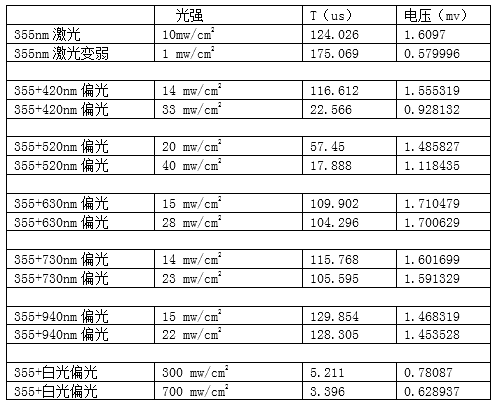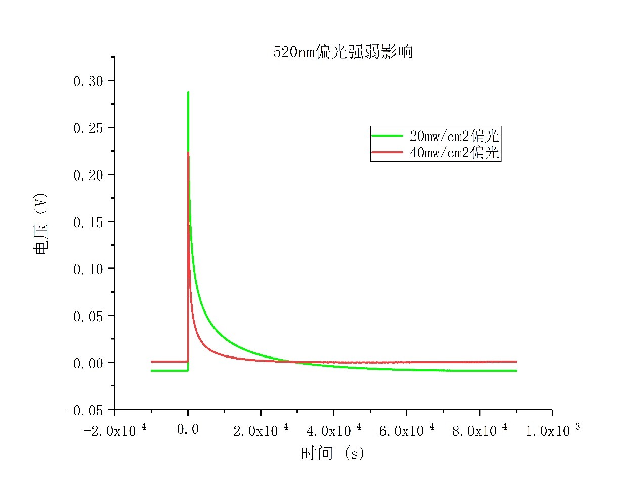 與(yǔ)穩態光電壓對比,CdS粉末樣品響(xiǎng)應波段為300nm-600nm,我們可以得知,當有樣品響應波段(duàn)的偏光照(zhào)射時,光強越強TPV壽(shòu)命越小,峰值越小。但是如果(guǒ)樣品對(duì)偏(piān)光沒有響應時,則TPV信號不受偏光(guāng)影響。