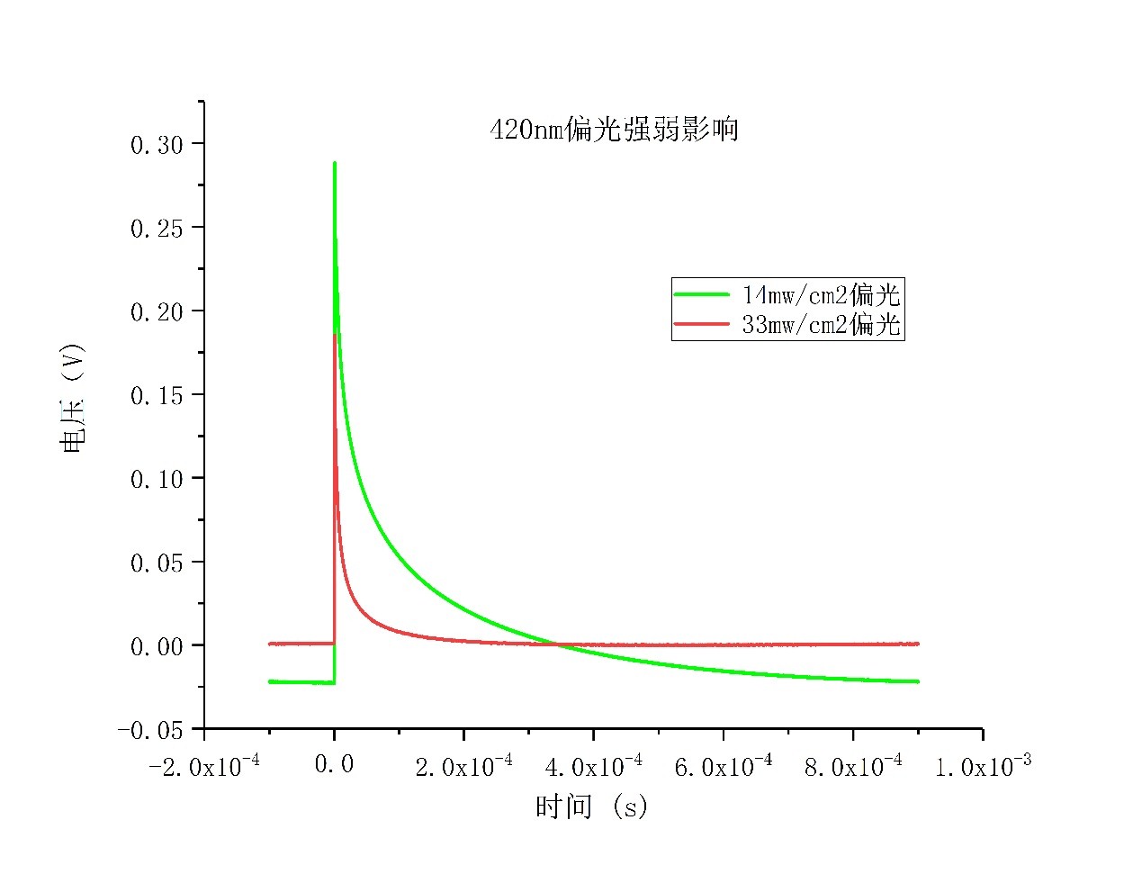 偏光420nm時,光強越強樣品TPV信號壽(shòu)命越小,峰值越小。