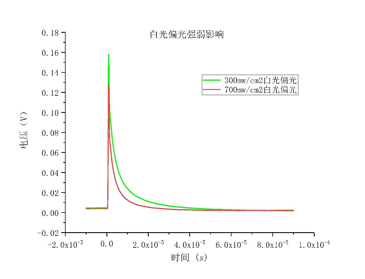 偏光為全光譜白光時,光強越強樣品(pǐn)TPV信號壽命越小,峰值越小。