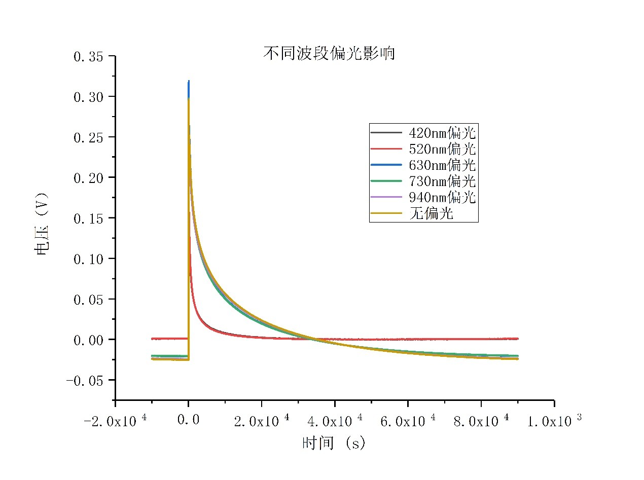 將不同波(bō)段偏(piān)光情況下TPV信號與無偏光TPV信號比對(duì),420nm、520nm偏光時TPV信號(hào)壽命減小(xiǎo),630nm、730nm、940nm偏光時TPV信號無顯著變化。