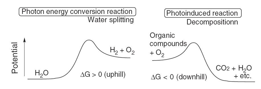 通常光催化反應分為兩大類,上坡反應和下坡反應,如圖1所示。上坡反應(uphill)必須有光子提供能量才(cái)能進行,如光催化分(fèn)解水和(hé)植物的光(guāng)合作(zuò)用。下(xià)坡反應(downhill)是能量釋放的過(guò)程,如光催化降解有(yǒu)機(jī)物(wù)。