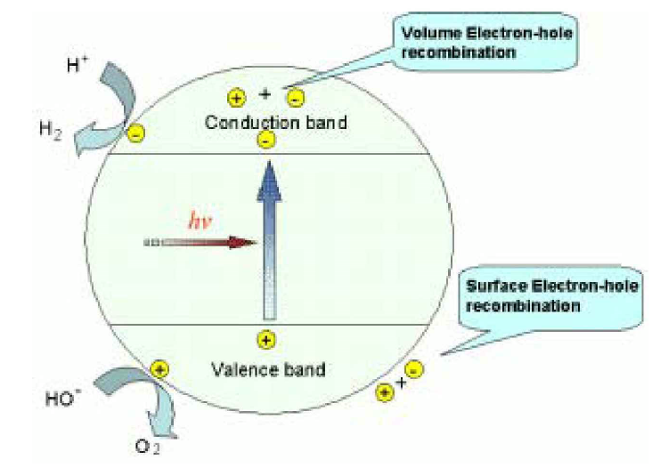 導帶的電子和價帶的空穴可以在很短時間內在光催化劑內部或表麵(miàn)複合,以熱或光的形式將能量釋放。因此加速電子—空穴對的分離,減少電子與空穴的複合,對提高光催(cuī)化反應的(de)效率有很大的作用。