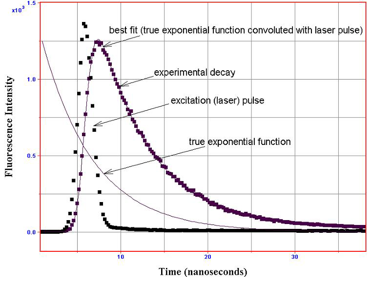 為了獲(huò)得熒光壽(shòu)命,除了測量熒光衰減曲線還必須測量儀器響應函數(即激發脈(mò)衝)。因為燈或激光脈衝的時間寬度是有限的,這會(huì)使樣品本征的熒光反應產生畸變。在典型的實驗中,要測量(liàng)兩條曲線:儀器(qì)響應函數和熒(yíng)光衰(shuāi)減(jiǎn)曲線。然(rán)後把儀器響應函數(shù)與模型(xíng)函數(單指數函數或雙指數函數)的卷積(jī)與實(shí)驗衰減結果比較。通過這一迭代數值過程直到與實驗衰減曲線一致。