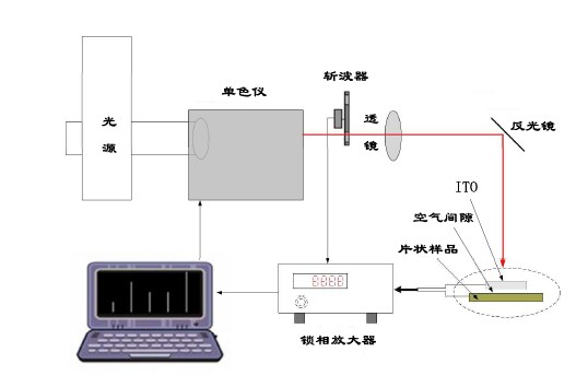 表麵光電壓檢測裝置主要由光源、單色(sè)器、斬波器與鎖相放大器、光(guāng)電壓池以及信號采集軟件構成,如圖2所示。一般采用氙燈作為光源,其在紫(zǐ)外及可見光譜範圍光強都比較(jiào)強。氙燈發射的光經透鏡係統處理獲得平行出射光,並進入光柵單(dān)色儀。經由光柵(shān)單色儀可以獲得具有較高分辨率的單色光,並經過外部光路引入光電壓池。