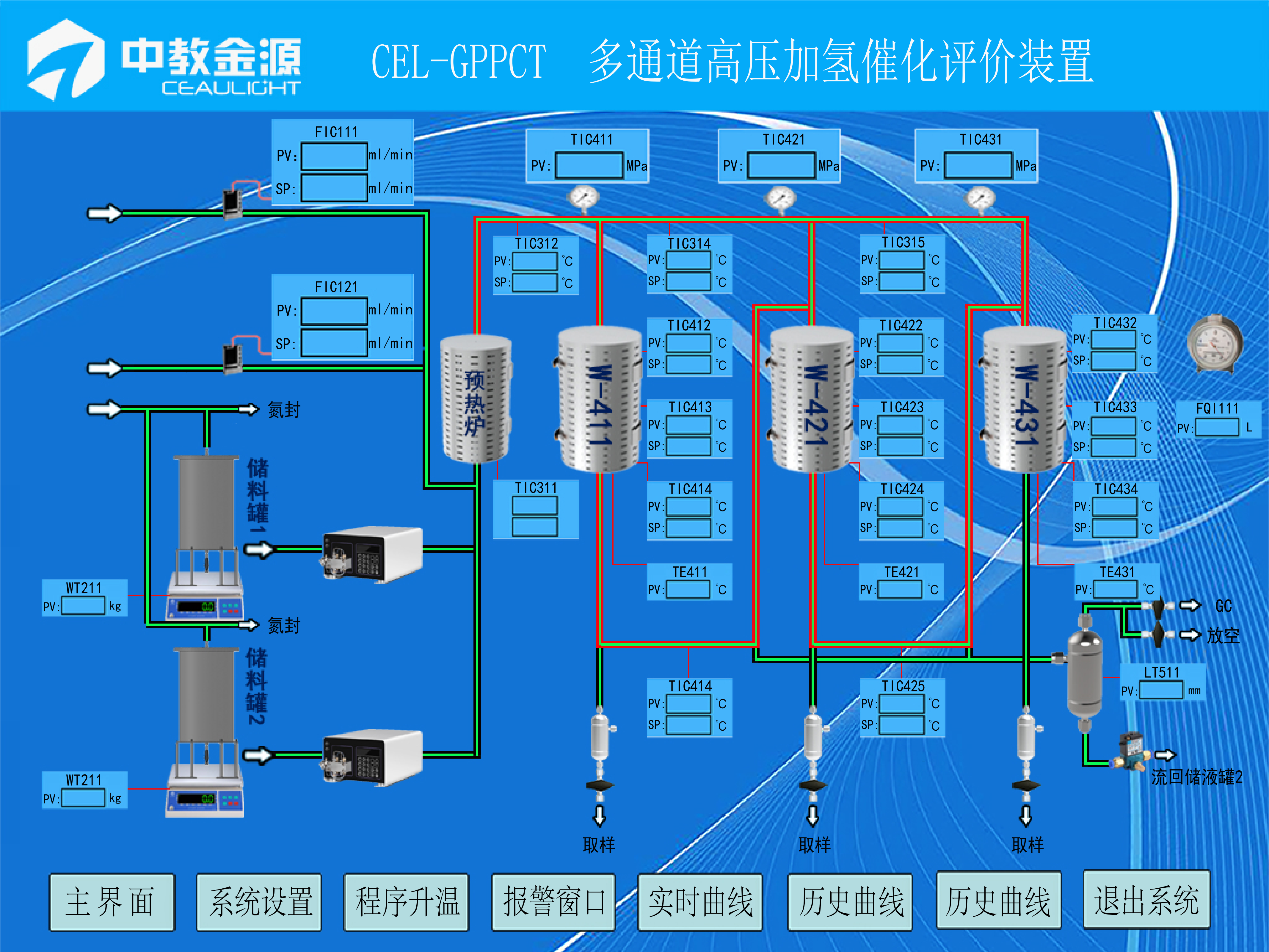 整機係統(tǒng)將溫度控製、氣體流量控製、液體流量控製、液(yè)位(wèi)高度控製等完全集中(zhōng)在工控一體機中,實現自動控製和實時反饋、監測、記錄。並可根據設置的報警界限自動(dòng)多級報警。