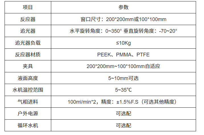 1、采用自(zì)動追光平台承載反(fǎn)應器(qì),使反應器在實驗過程中保(bǎo)持陽光直射,創造充足的光照條件。適用於氣固相、氣液固光催化(huà)反應,催化劑基底采用亞克力板、石英片(piàn),無紡布等。