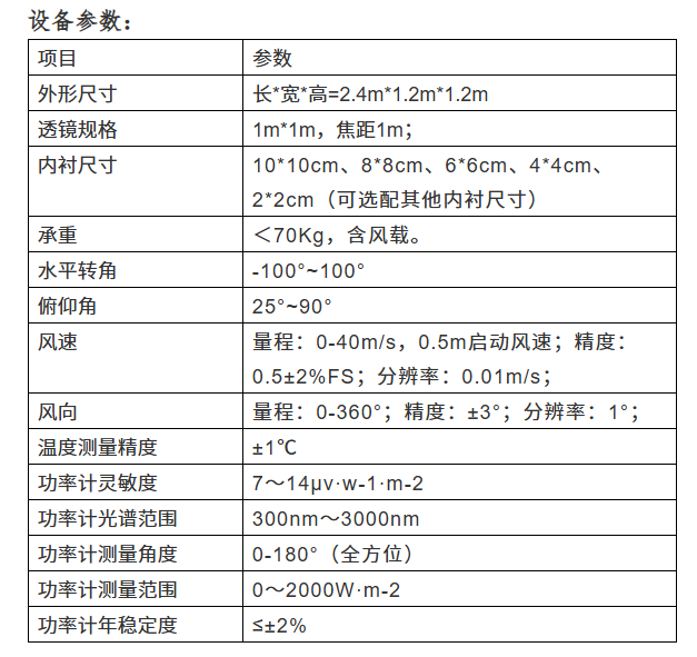 本裝置帶有自動追(zhuī)光係統,使太陽光線(xiàn)垂直(zhí)照射在菲涅爾透鏡表麵,匯聚後經視窗(chuāng)投(tóu)射進反應器內部(bù),為反應器內部所需要的溫(wēn)度;係統底部帶有腳輪,可隨意移動(dòng)至(zhì)任意(yì)實驗(yàn)場所進行實驗研究。