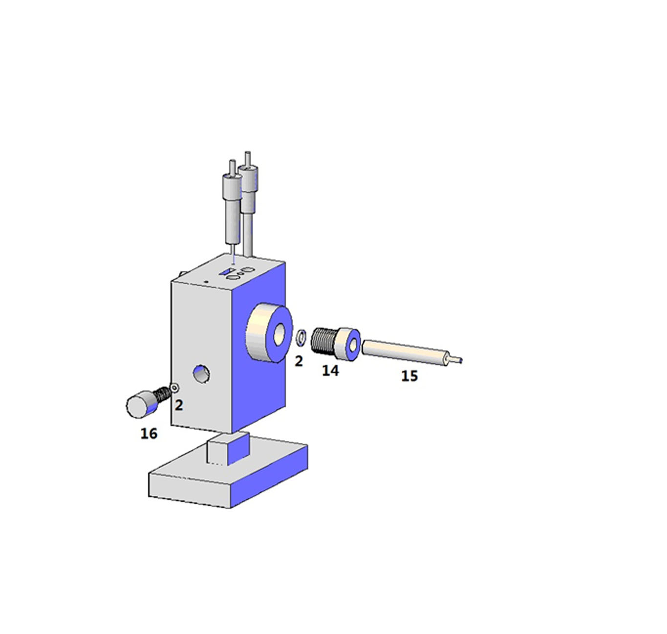13—加(jiā)液口;14—工作電極四氟密封(fēng)螺(luó)絲。當使用玻碳,鉑電(diàn)極等做工作電極時,如圖依次在電極上套上密封螺絲和O型圈(quān),將14擰在池體上,調節好電極(jí)進入池體的位置,最後擰緊即可。15-工作電極;16-排液口四氟密封塞。