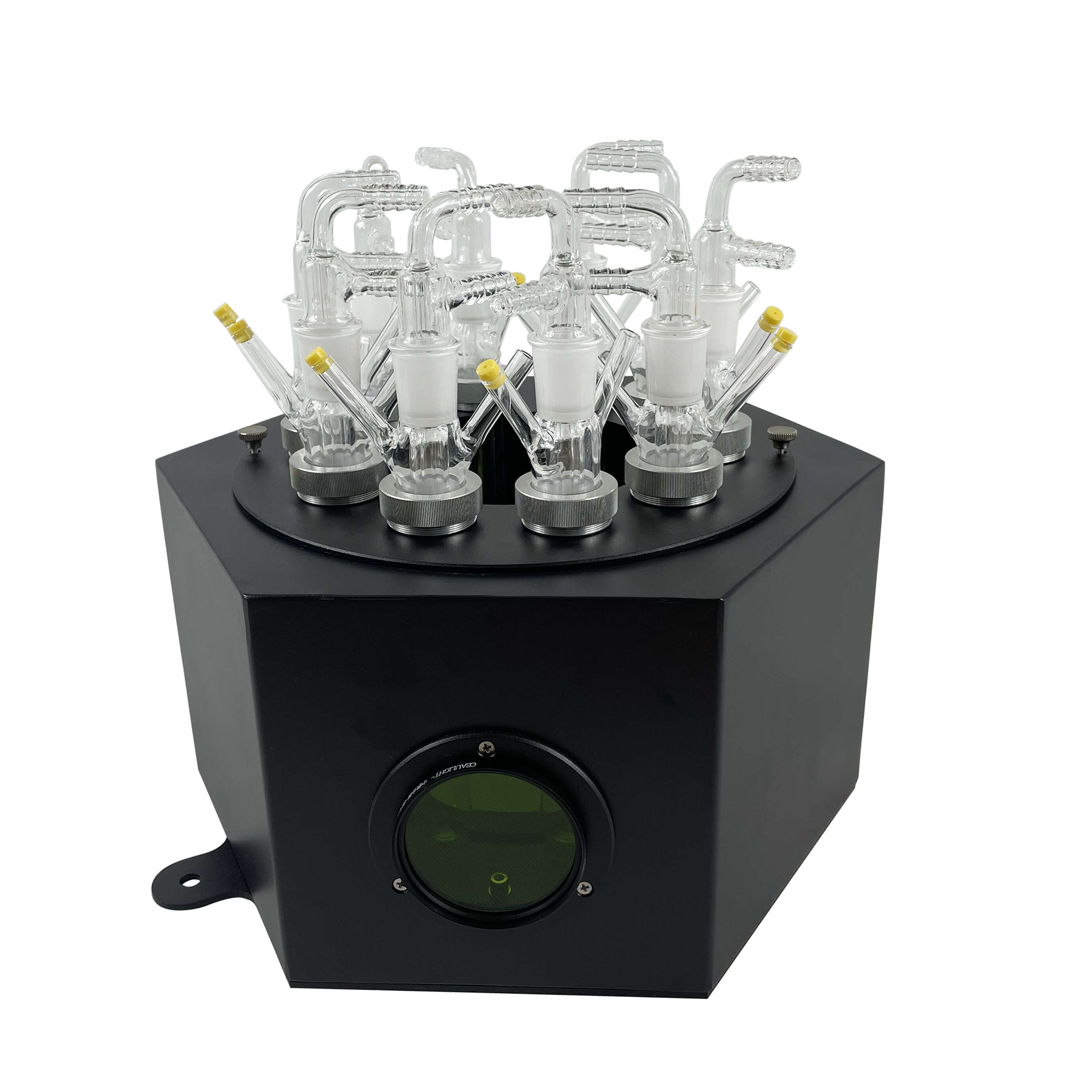 平行光化學反應儀(yí)可應用到光催化劑的篩選(xuǎn),提高光催化的效率,實現了平行樣品的(de)分析。主要用(yòng)於研究氣相或液(yè)相介質,固定或流動體係,紫外光、單色光、可見光或模擬太陽光光照,恒(héng)溫,同一光(guāng)強等條件下的光化學(xué)反應(yīng)。具有(yǒu)提供分析反應產物,測定反應動力(lì)學(xué),測定量子產率等功能,廣泛應用光化學催化、化學合成、環境保護以及生命科學等研究領域。