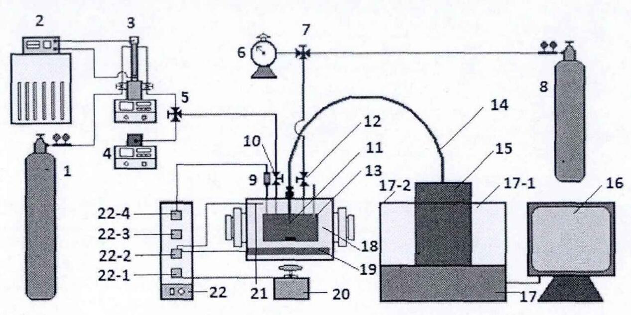 1.二氧化碳氣瓶,2.冷卻泵,3.高壓注射泵,4.計量泵,5.氣液三通(tōng)閥,6.真空泵,7.氮氣三通閥門,8.氮氣瓶,9.壓力傳感器,10.進(jìn)樣閥門,11.ATR紅外傳感器,12.排氣閥門,13.測溫熱電偶,14.IR光導纖維,15.反射倉,16.計算機,17.FT-IR紅外光譜儀,18.高壓反應釜(紅外樣品池),19.加熱器,20.磁力攪拌,21.控溫熱電偶,22.控製器(qì),22-1.電磁攬拌器調速器,22-2.溫度(dù)控製器,22-3.溫度顯示器,22-4.壓力顯示儀