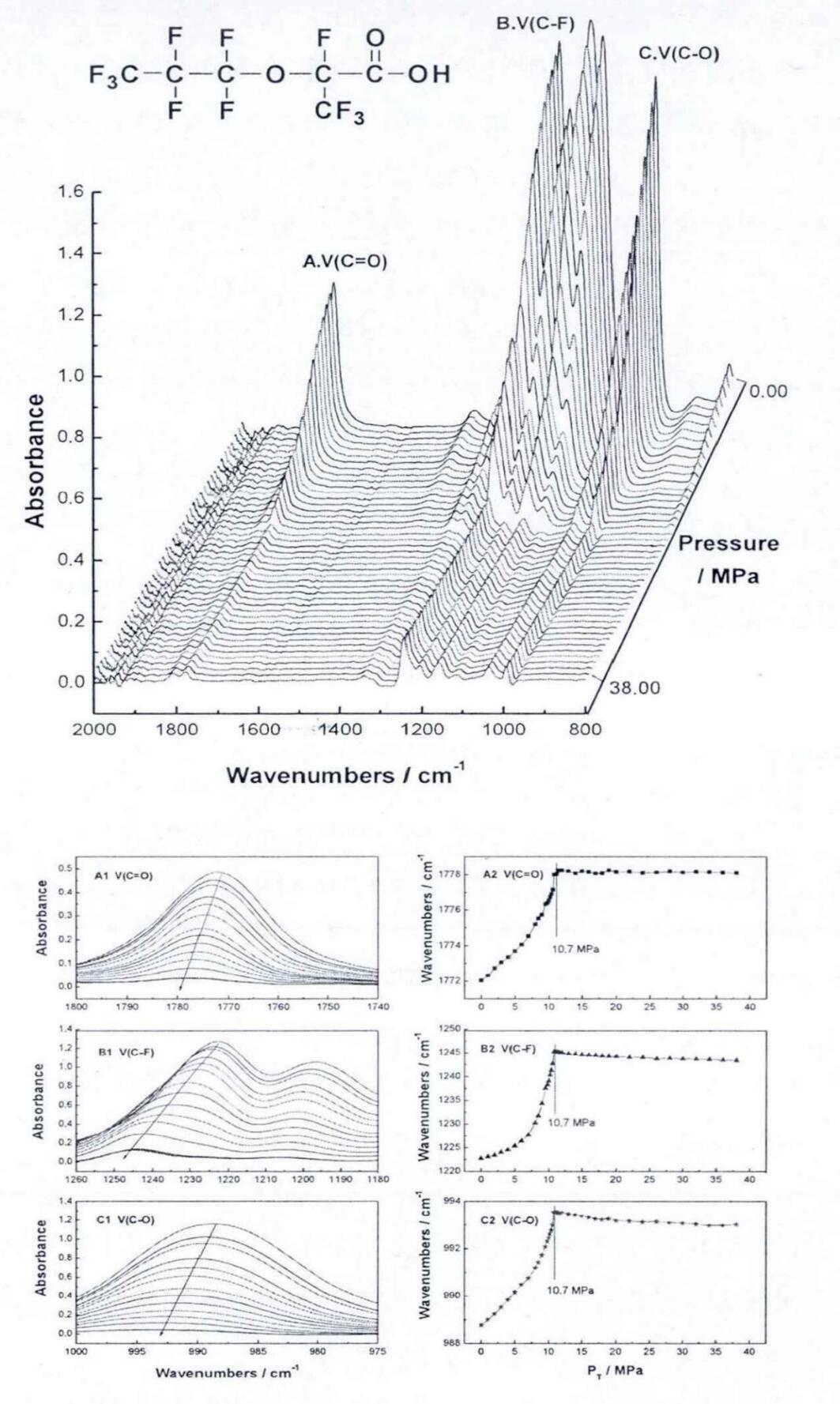 FT-IR對極(jí)性(xìng)共價(jià)鍵非常敏感,因此FT-IR就成為一種探究分散質(zhì)-scCO2體係(xì)的分子間相互作用的有效技(jì)術手段。HP ATR FI-IR可測量高濃度樣品(pǐn),實時監測scCO2體係中的物(wù)理化學變化過程(chéng)中紅外吸收光譜的變化。因此,HP ATR FI-IR被認為(wéi)是研究(jiū)scCO2體係溶劑化作用和化學反應過(guò)程的有效(xiào)方(fāng)法。因此自(zì)主設計研(yán)發的高壓原位中紅外光譜在線監測裝置(HP ATR FT-MIR)可以在不同壓力或溫度條件下(xià),實時在線監測scCO2與分散質組成的二組分(fèn)體係的相行為及溶劑化作用過程。