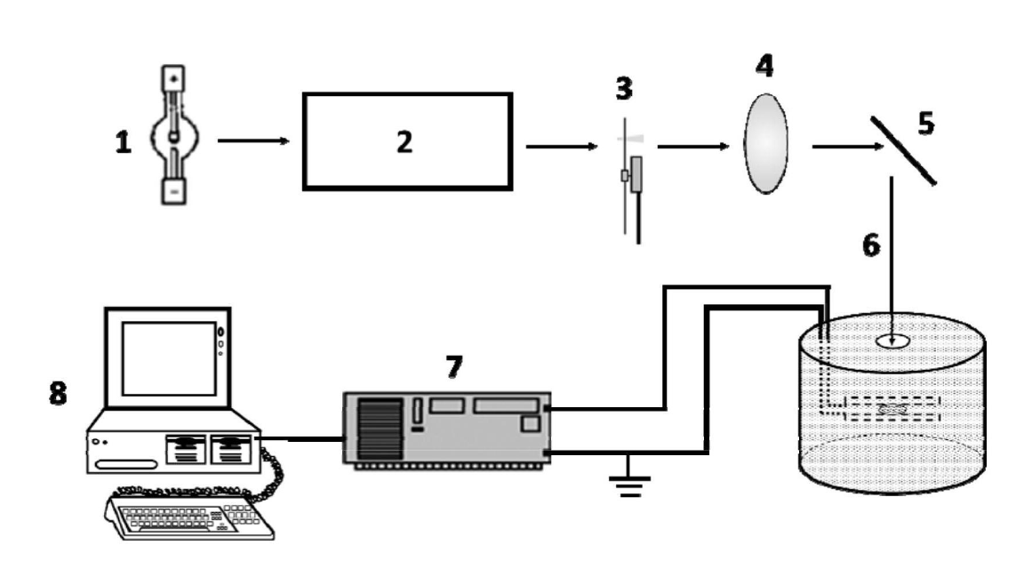 (1.氙燈光源;2.單色儀;3.斬波器(斯坦福);4.匯聚透鏡;5.反射鏡;6頻率調(diào)製光;7鎖相放大器(斯坦福);8計算機含控製軟(ruǎn)件(jiàn))