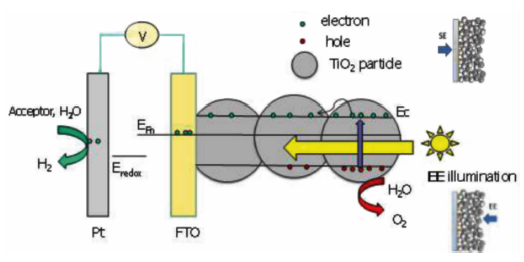 當用能量等於(yú)或高(gāo)於半(bàn)導體吸收閾值的(de)光照射塊狀半(bàn)導體時,半導體的價帶電子可被激發躍遷到導,同時在價帶產生相應(yīng)的空穴(xué),從而在半導體內部產生電子(zǐ)-空穴(xué)對。 光生電子(zǐ)-空穴對在空間電荷層電場的作用下,空穴遷移到半導體粒子表麵與溶液中的電子供體發生氧化反應,而電子與電子受體發生還(hái)原反應(yīng), 或者向電極基底(dǐ)運動並通過外電路到達對電(diàn)極參與還原反應。